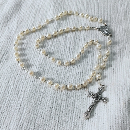 Rosario Peltre-Perla Fantasía. Largo 43cm. Marieta 1,5x2cm. Cuentas 7mm. Cruz 2,5x 3,5cm.