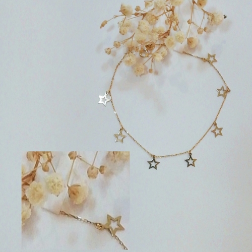 Cadena y 7 estrellas caladas en oro 18k. Largo: 19 cm. Peso: 1.08