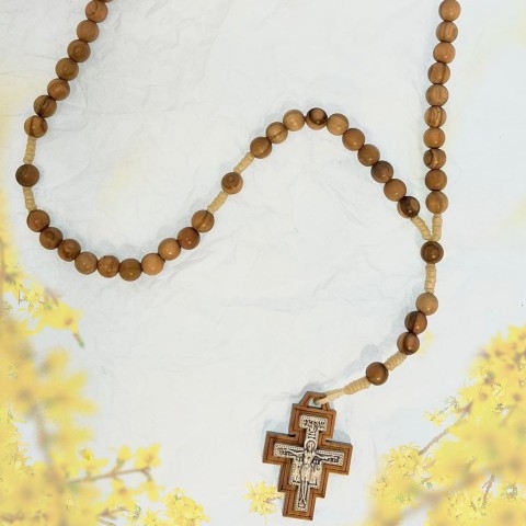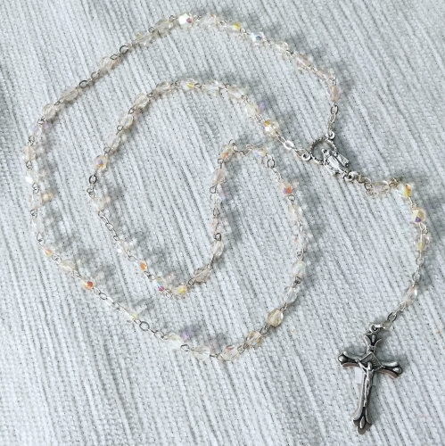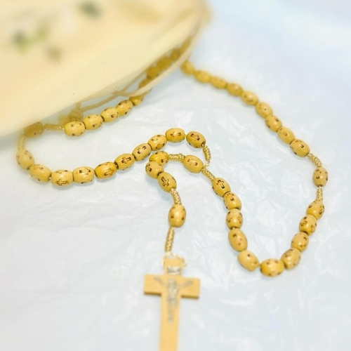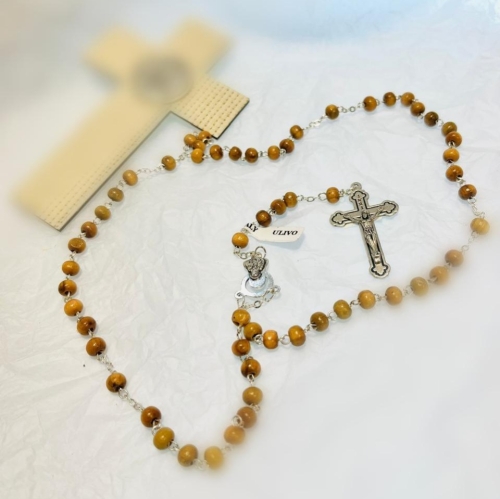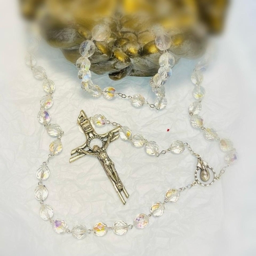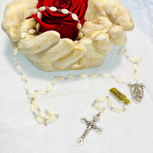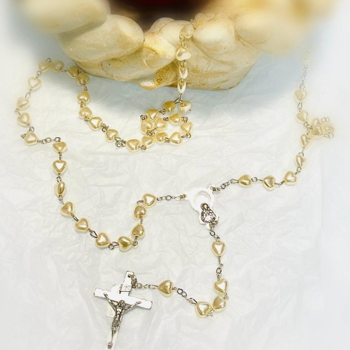 Rosario Peltre-Perla Fantasía. Largo 43cm. Marieta 1,5x2cm. Cuentas 7mm. Cruz 2,5x 3,5cm.
