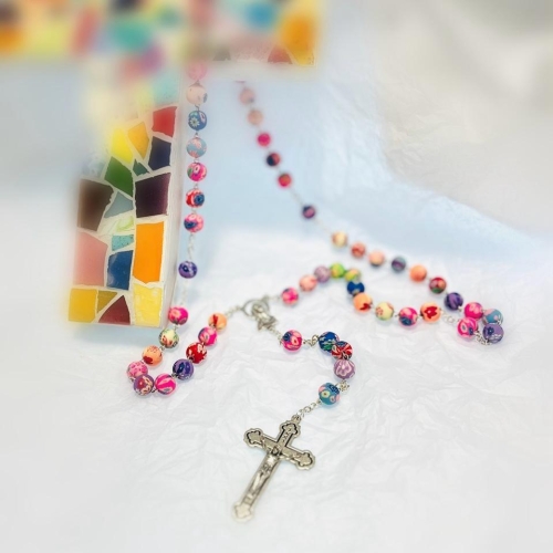 Rosario Peltre-Piedra colores. Largo 47cm. Marieta 3cm. Cuentas 7mm. Cruz 3,5x 2,5cm.