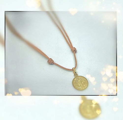 San Benito de Pie con Cordón. Oro 18k. Cordón Seda 1mm. Medalla 10mm. 0,45g.